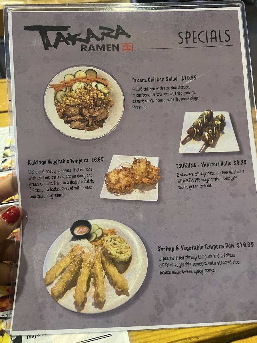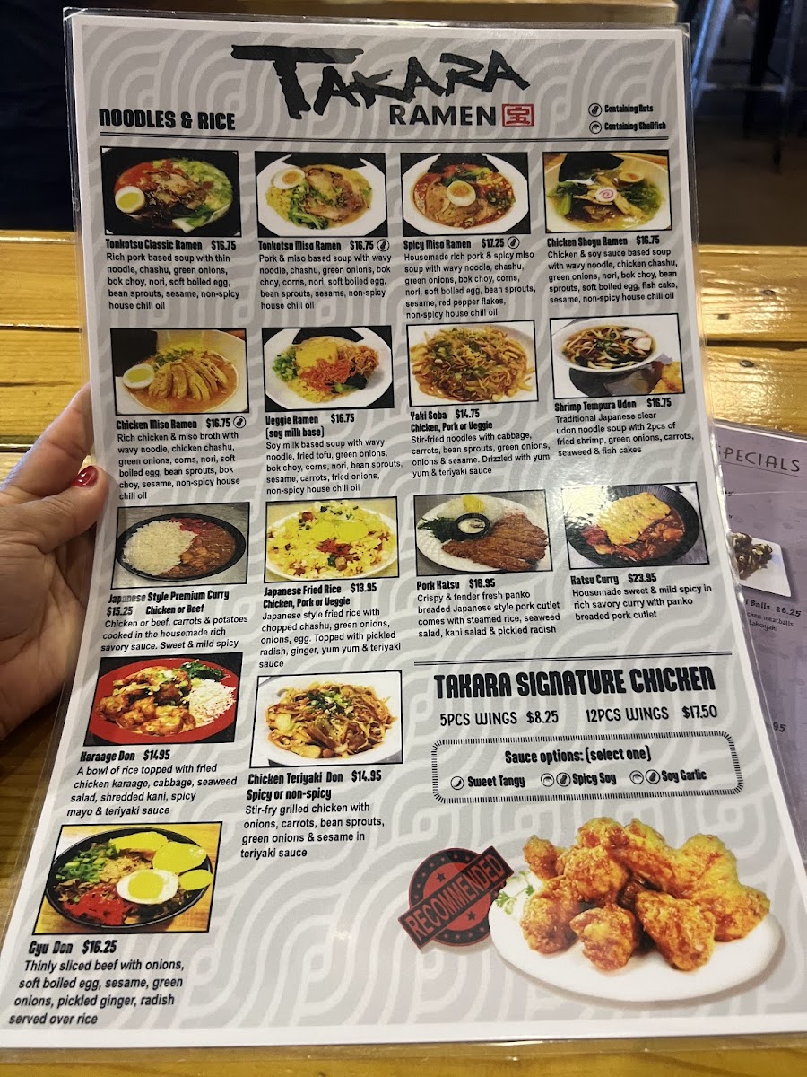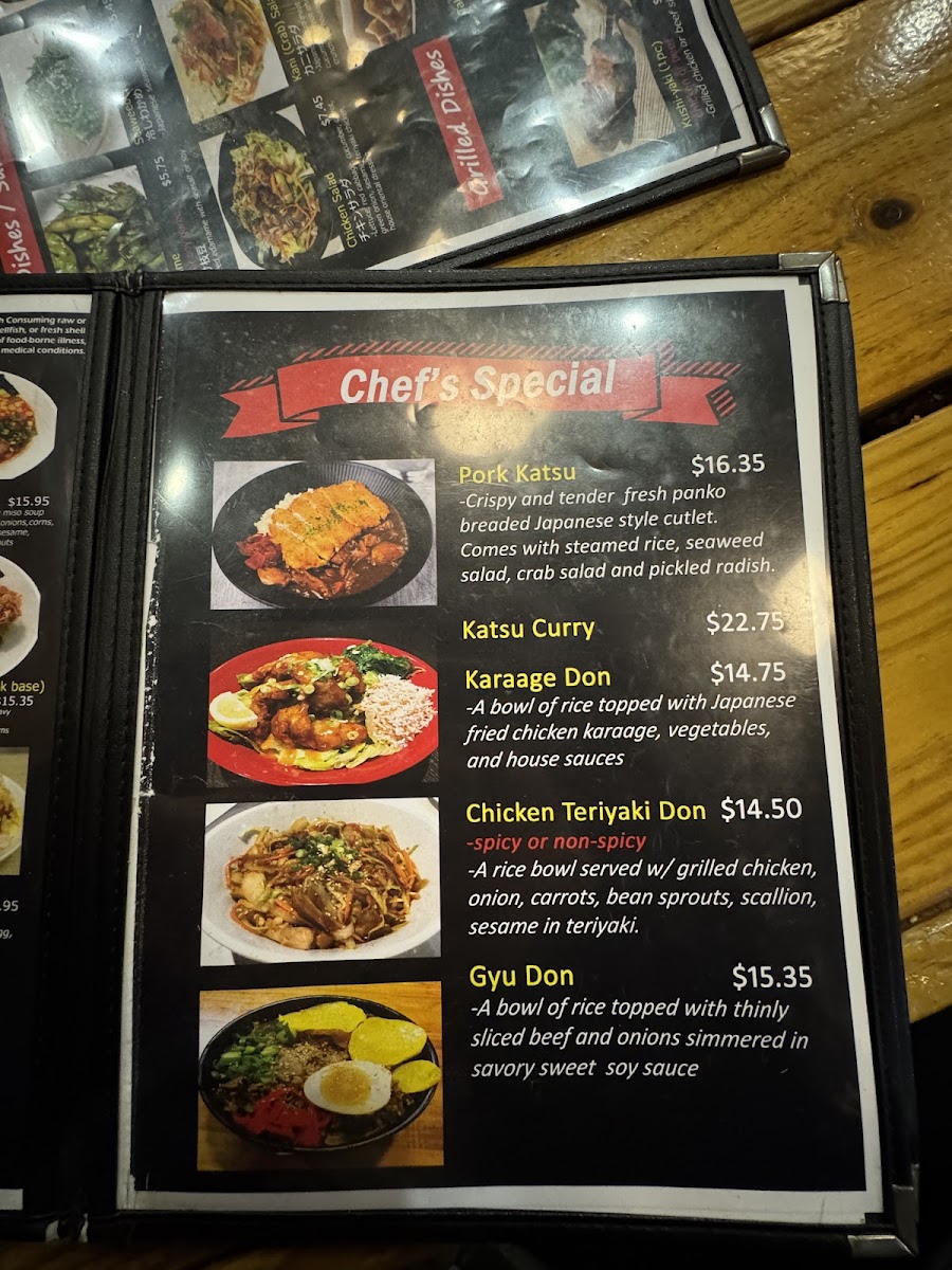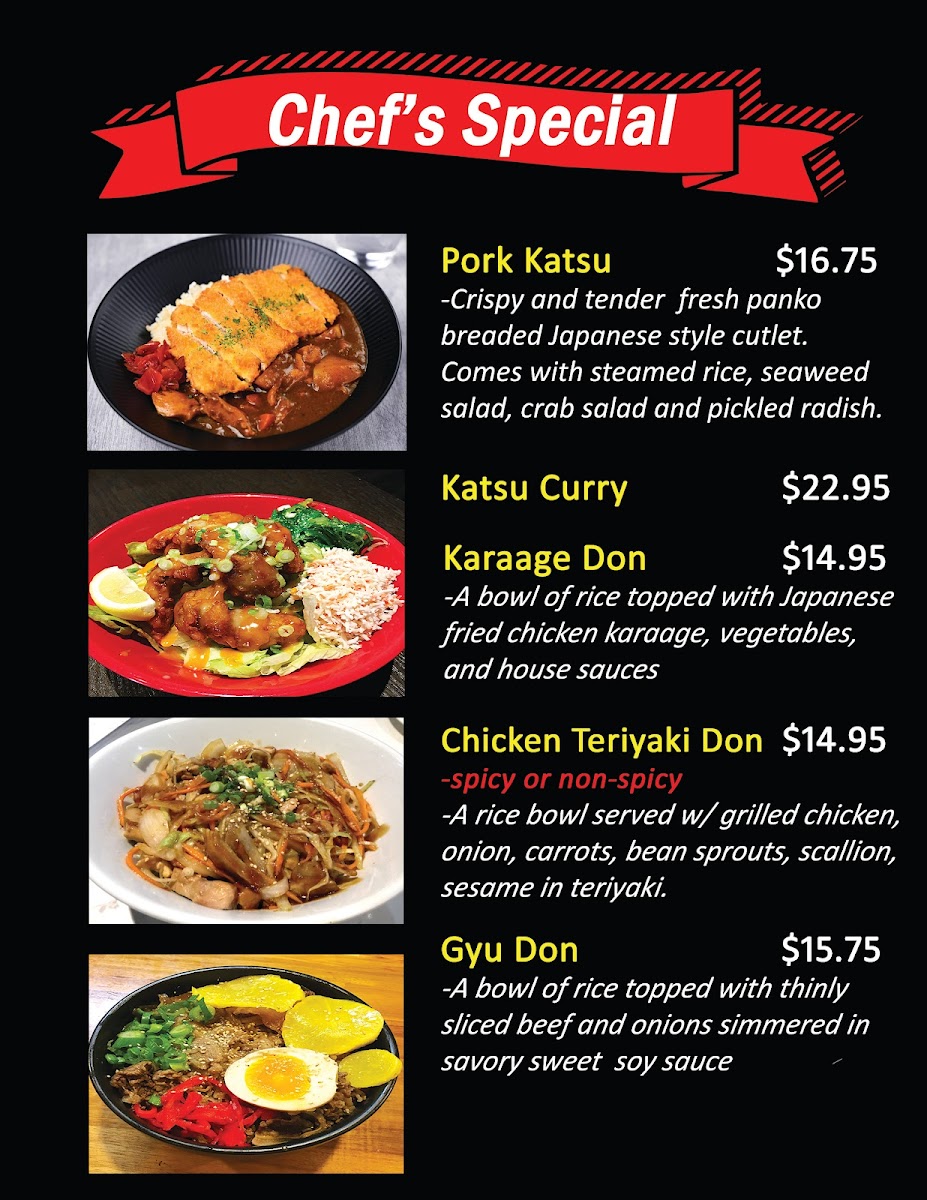 - Ramen & Rice Dishes: A variety of ramen styles such as Tonkotsu Miso Ramen, Spicy Miso Ramen, Chicken Shoyu Ramen, and Vegetarian Ramen with a soy milk base are available. Rice dishes include Japanese Fried Rice and Gyu Don, offering options for a satisfying meal.