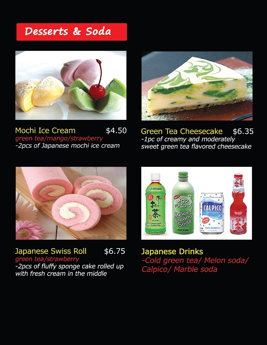 - Beverages: A range of drinks includes bottled Japanese green teas, classic soft drinks like Coke, Sprite, Diet Coke, Japanese carbonated Ramune soda, and specialty matcha milk tea.